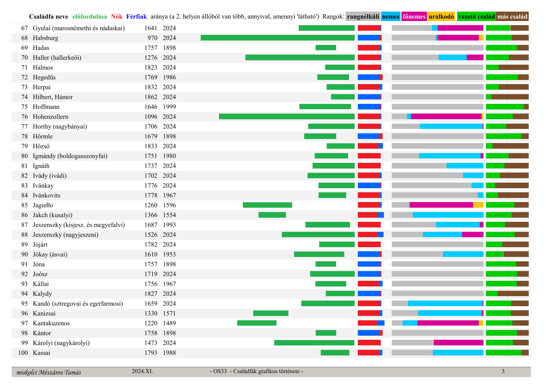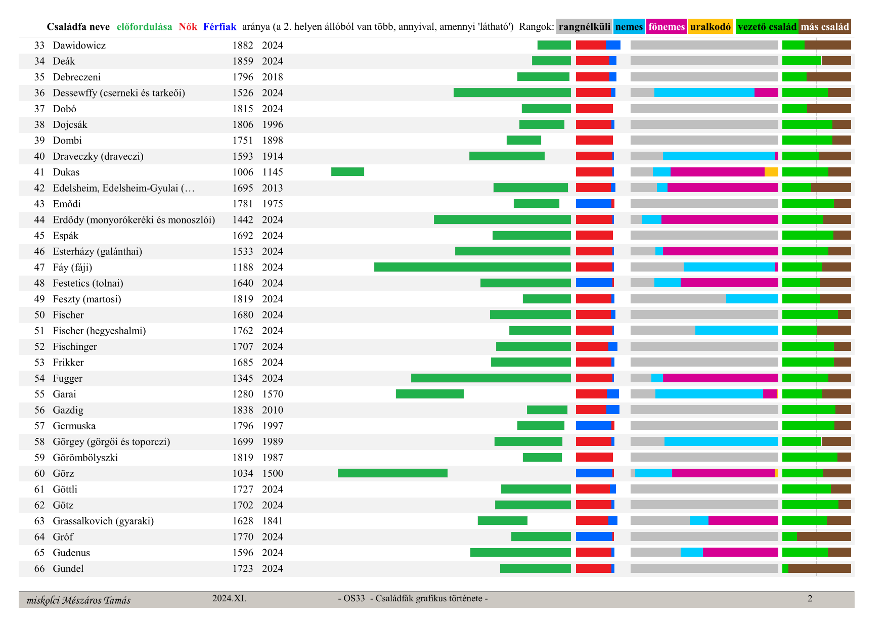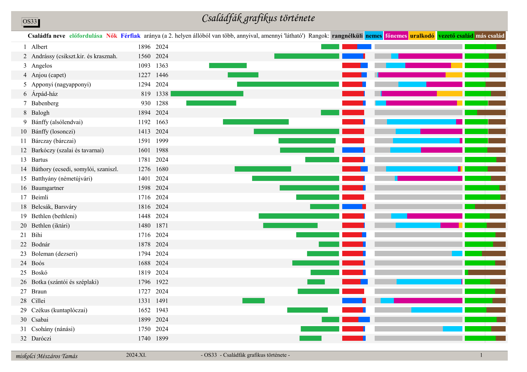 OS33 Családfák grafikus története (Graphic history of family trees) Family tree name, occurrence in time (from, to) ratio – green section, Women – red, Men – blue (whichever is in 2nd place has more, by the visible amount), secular ranks: no rank – grey, noble – light blue, high noble – purple, monarch – orange, last column: leading family – green, other families – brown (their ratio)