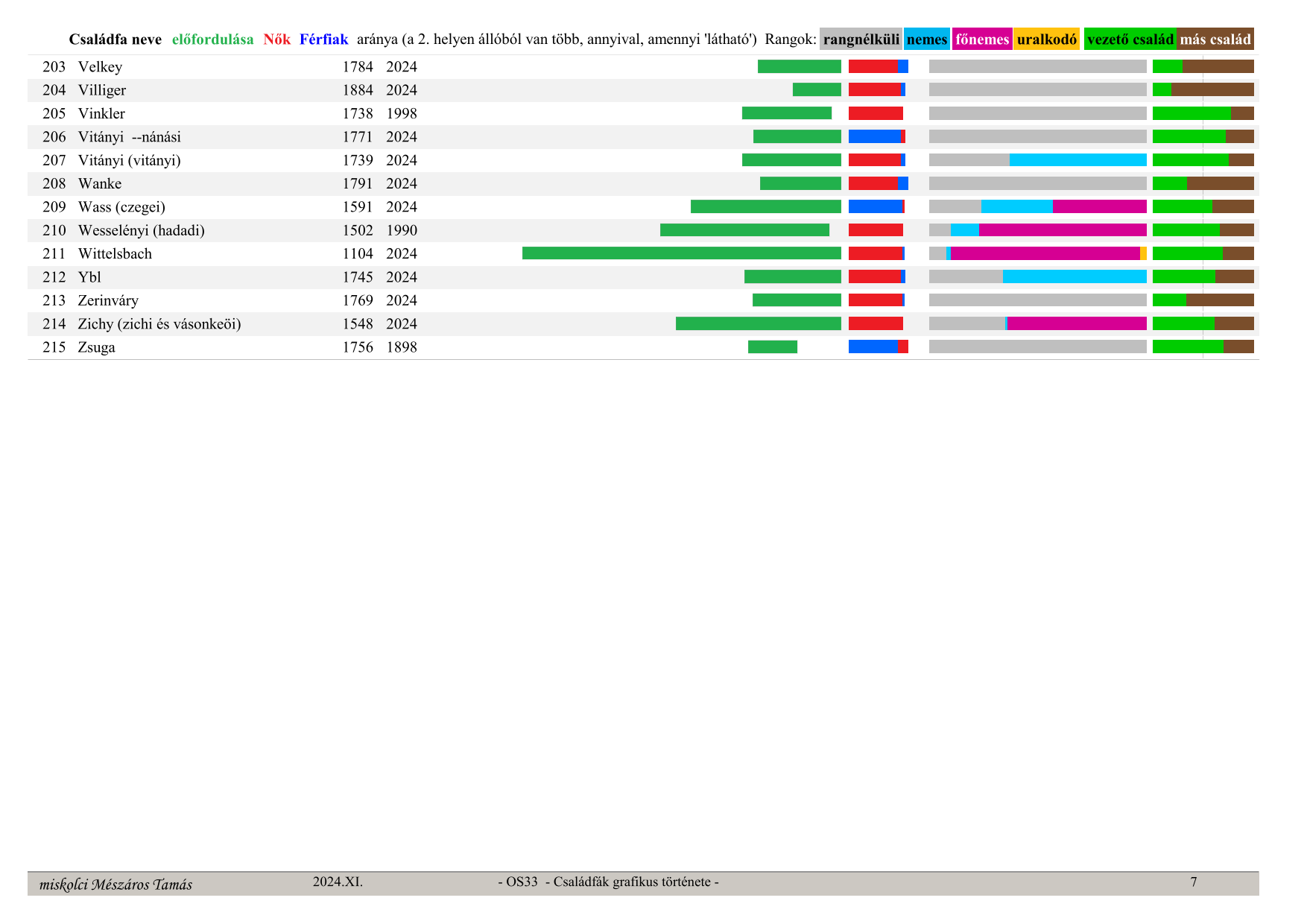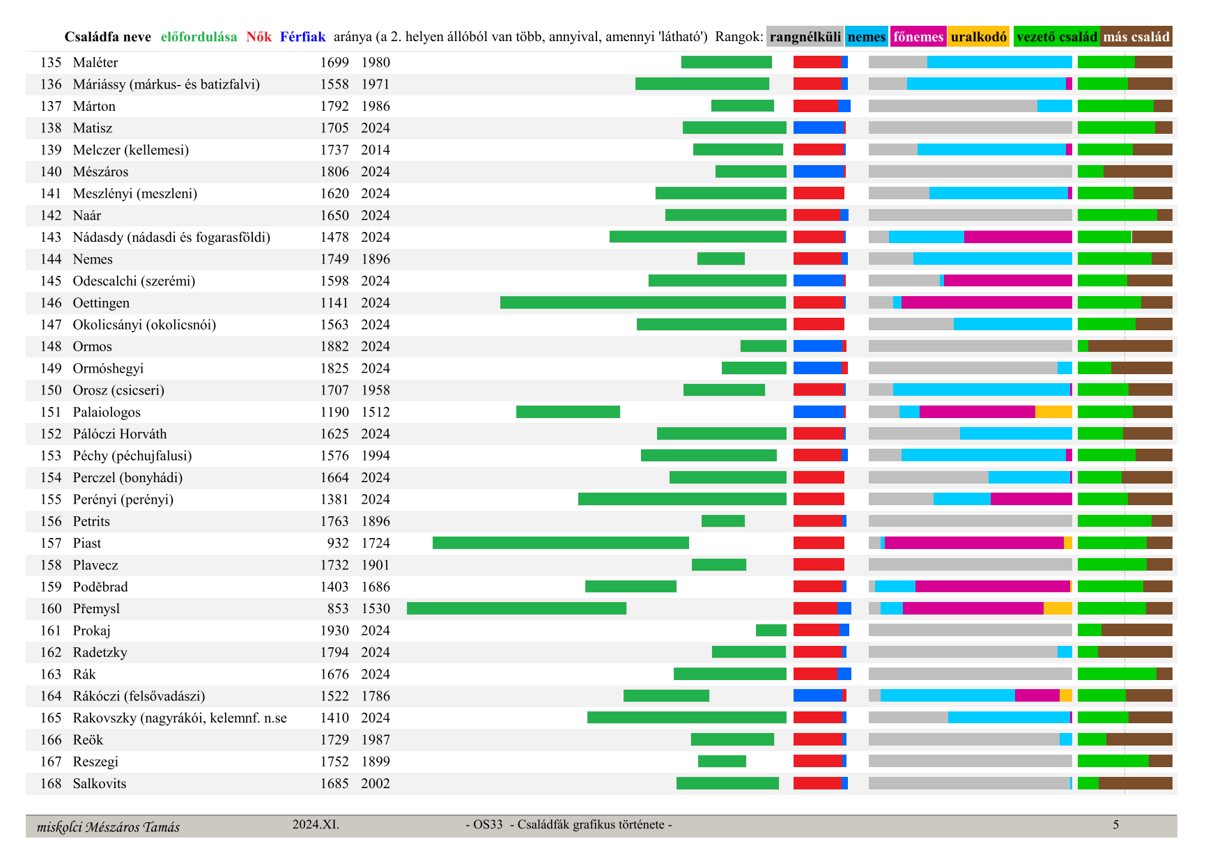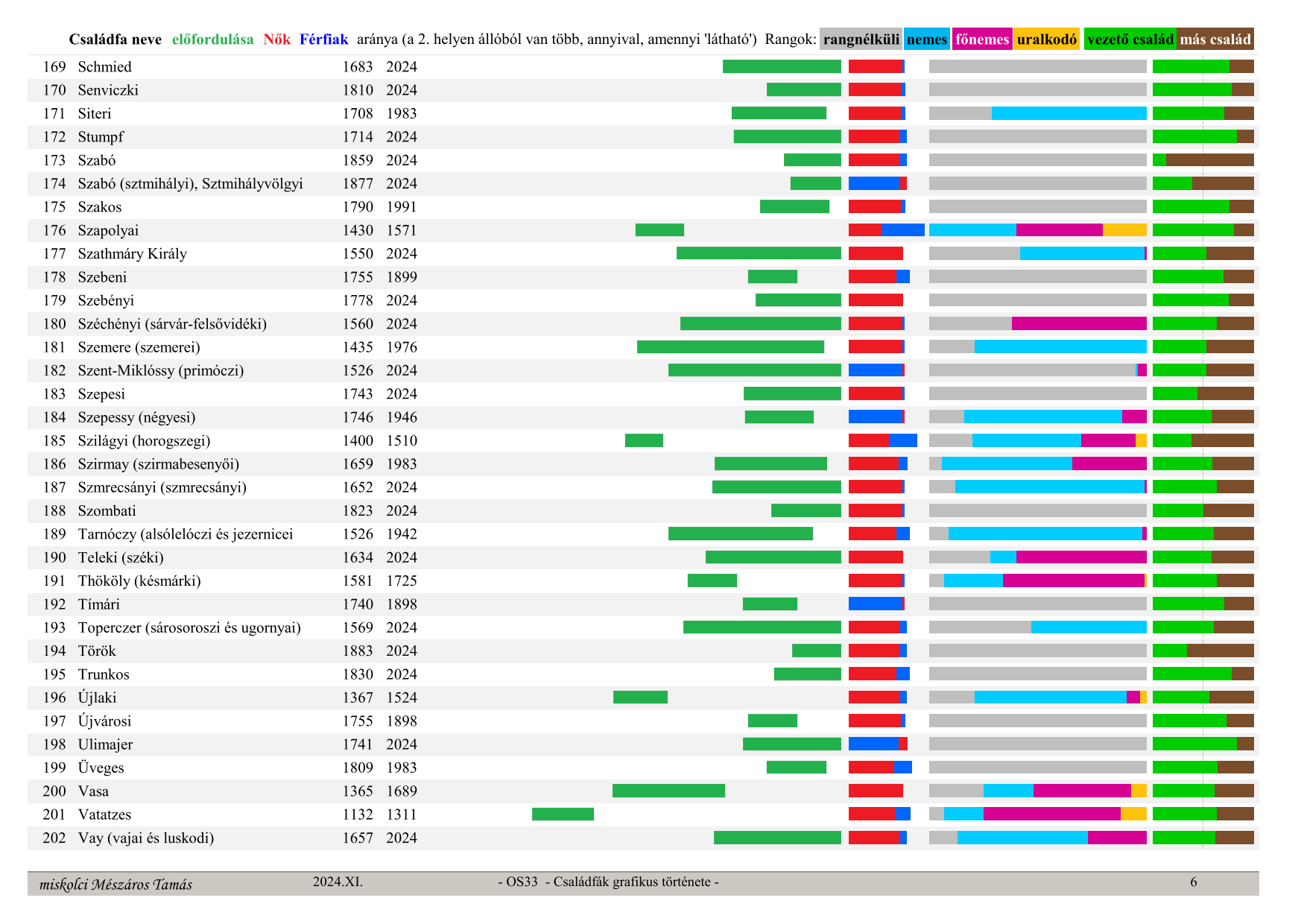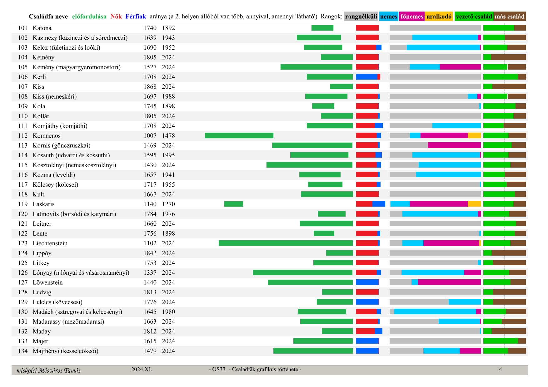 OS33 Családfák grafikus története (Graphic history of family trees) Family tree name, occurrence in time (from, to) ratio – green section, Women – red, Men – blue (whichever is in 2nd place has more, by the visible amount), secular ranks: no rank – grey, noble – light blue, high noble – purple, monarch – orange, last column: leading family – green, other families – brown (their ratio)