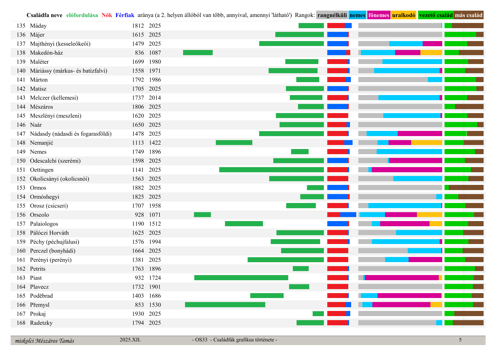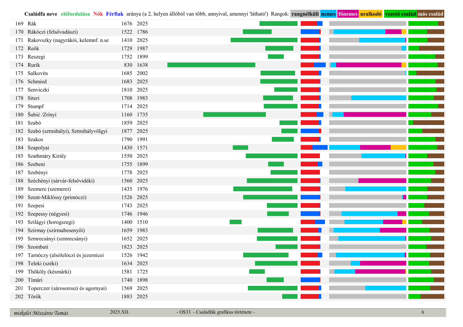 OS33 Családfák grafikus története (Graphic history of family trees) Family tree name, occurrence in time (from, to) ratio – green section, Women – red, Men – blue (whichever is in 2nd place has more, by the visible amount), secular ranks: no rank – grey, noble – light blue, high noble – purple, monarch – orange, last column: leading family – green, other families – brown (their ratio)