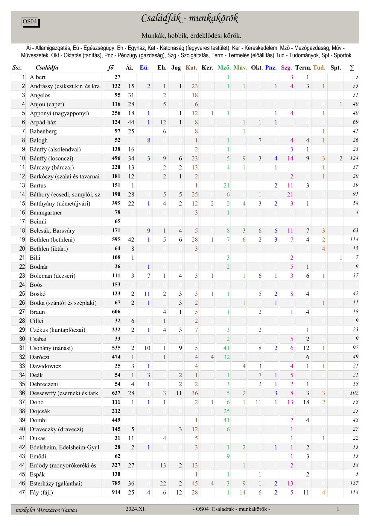 OS04 Családfák - Munkakörök (Occupations) Works, hobbies, interests (per person and summarized) 1. State administration (Ái), 2. Healthcare (Eü), 3. Church (Eh), 4. Law, 5. Military (Kat), 6. Trade (Ker), 7. Agriculture (Mző), 8. Arts (Műv), 9. Education, teaching (Okt), 10. Finance, economy (Pnz), 11. Service (Szg), 12. Production, manufacture (Term), 13. Sciences (Tud), 14. Sports (Spt)