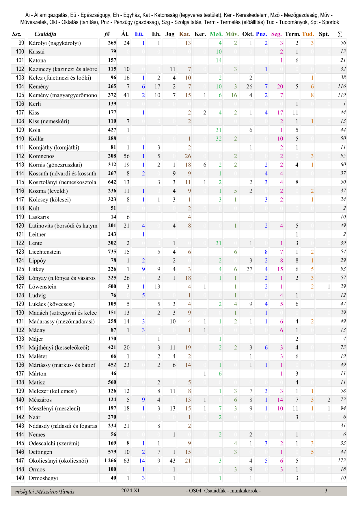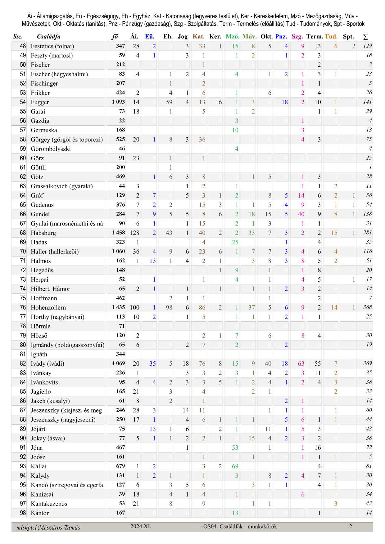 (Ocupaciones) Trabajos, pasatiempos, intereses (por persona y resumidos): 1. Administración estatal (Ái), 2. Salud (Eü), 3. Iglesia (Eh), 4. Derecho, 5. Militar (Kat), 6. Comercio (Ker), 7. Agricultura (Mző), 8. Artes (Műv), 9. Educación, enseñanza (Okt), 10. Finanzas, economía (Pnz), 11. Servicio (Szg), 12. Producción, fabricación (Term), 13. Ciencias (Tud), 14. Deportes (Spt).