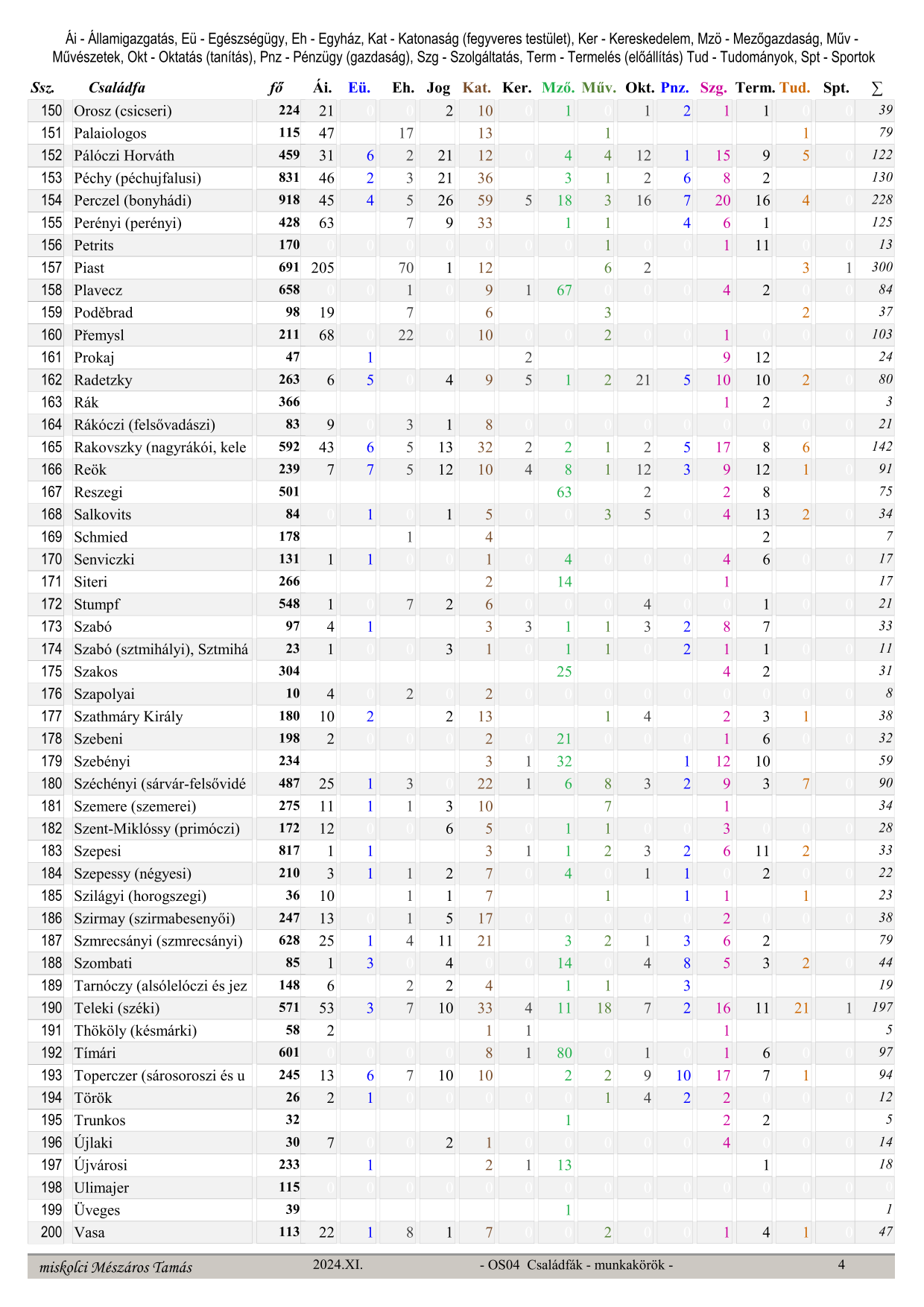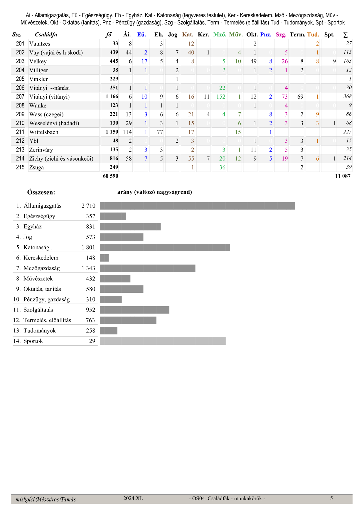(Stanowiska/Zawody) Prace, hobby, zainteresowania (na osobę i sumarycznie): 1. Administracja państwowa (Ái), 2. Służba zdrowia (Eü), 3. Kościół (Eh), 4. Prawo, 5. Wojsko (Kat), 6. Handel (Ker), 7. Rolnictwo (Mző), 8. Sztuka (Műv), 9. Edukacja, nauczanie (Okt), 10. Finanse, gospodarka (Pnz), 11. Usługi (Szg), 12. Produkcja, wytwarzanie (Term), 13. Nauki (Tud), 14. Sport (Spt).