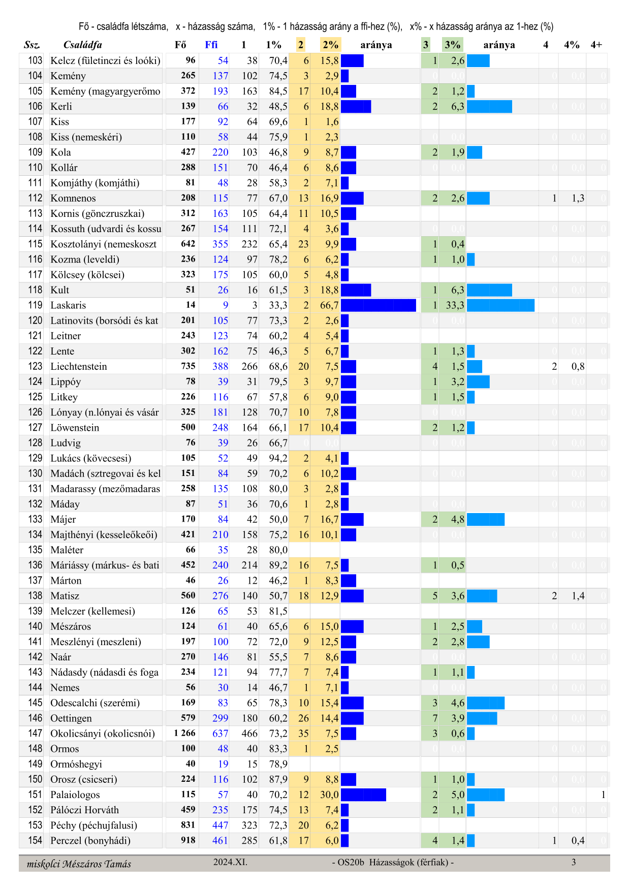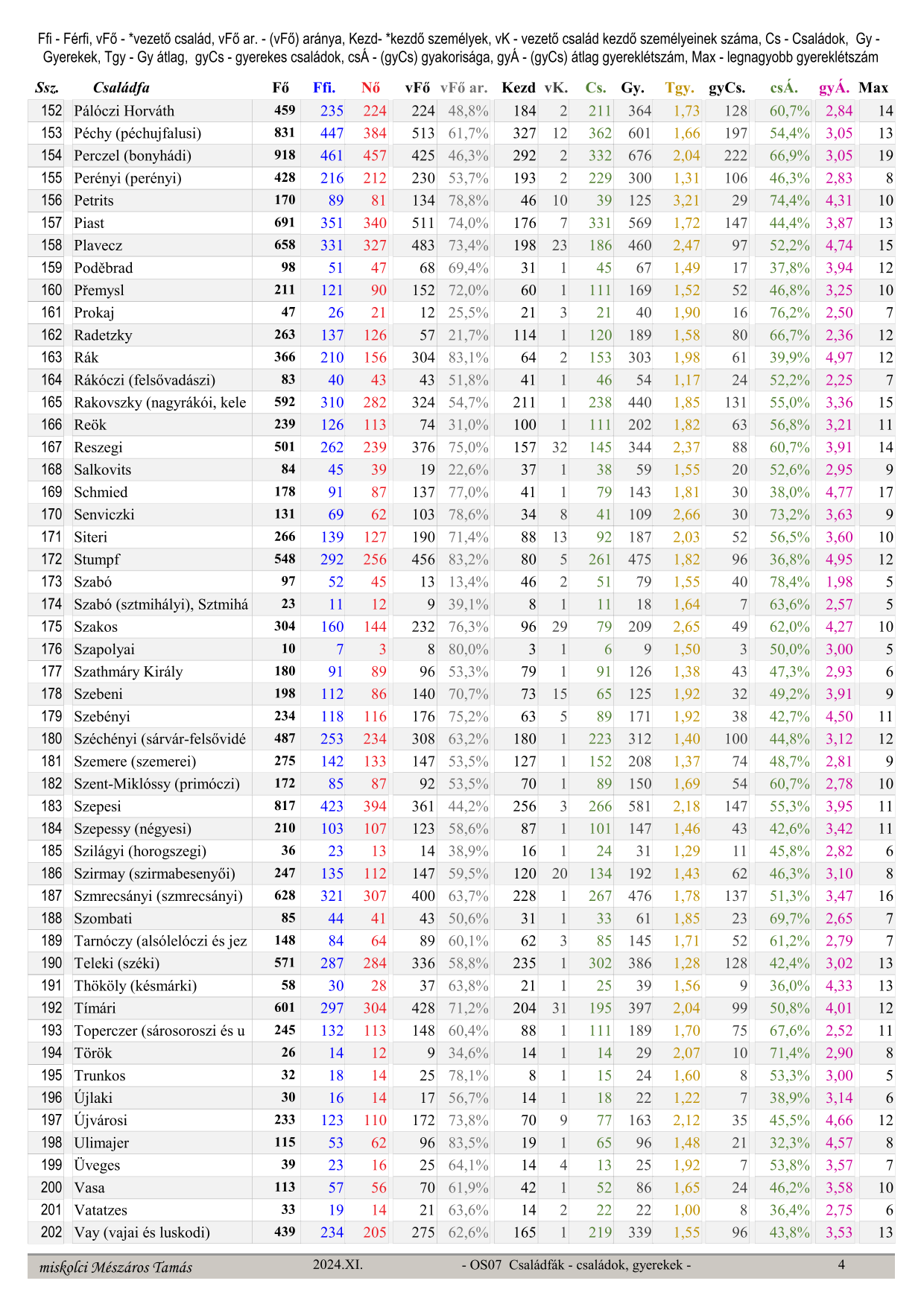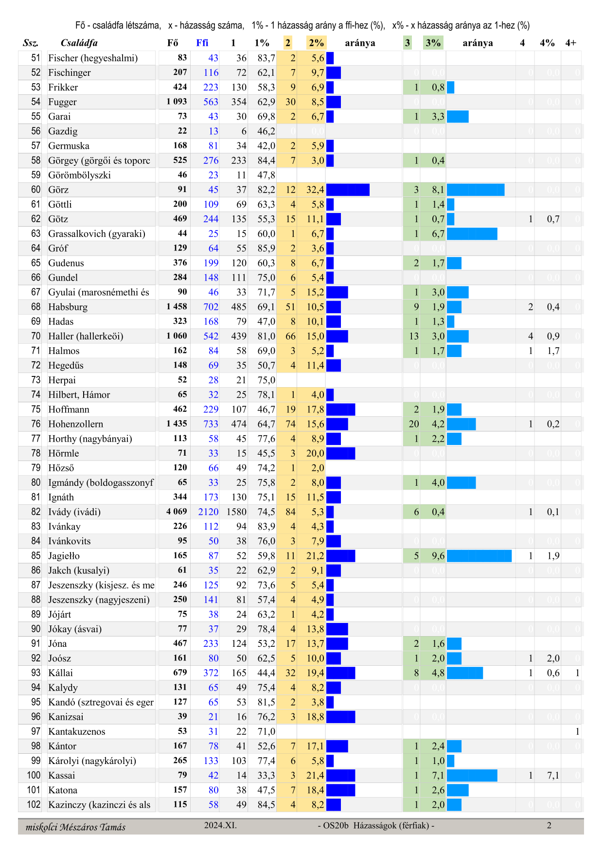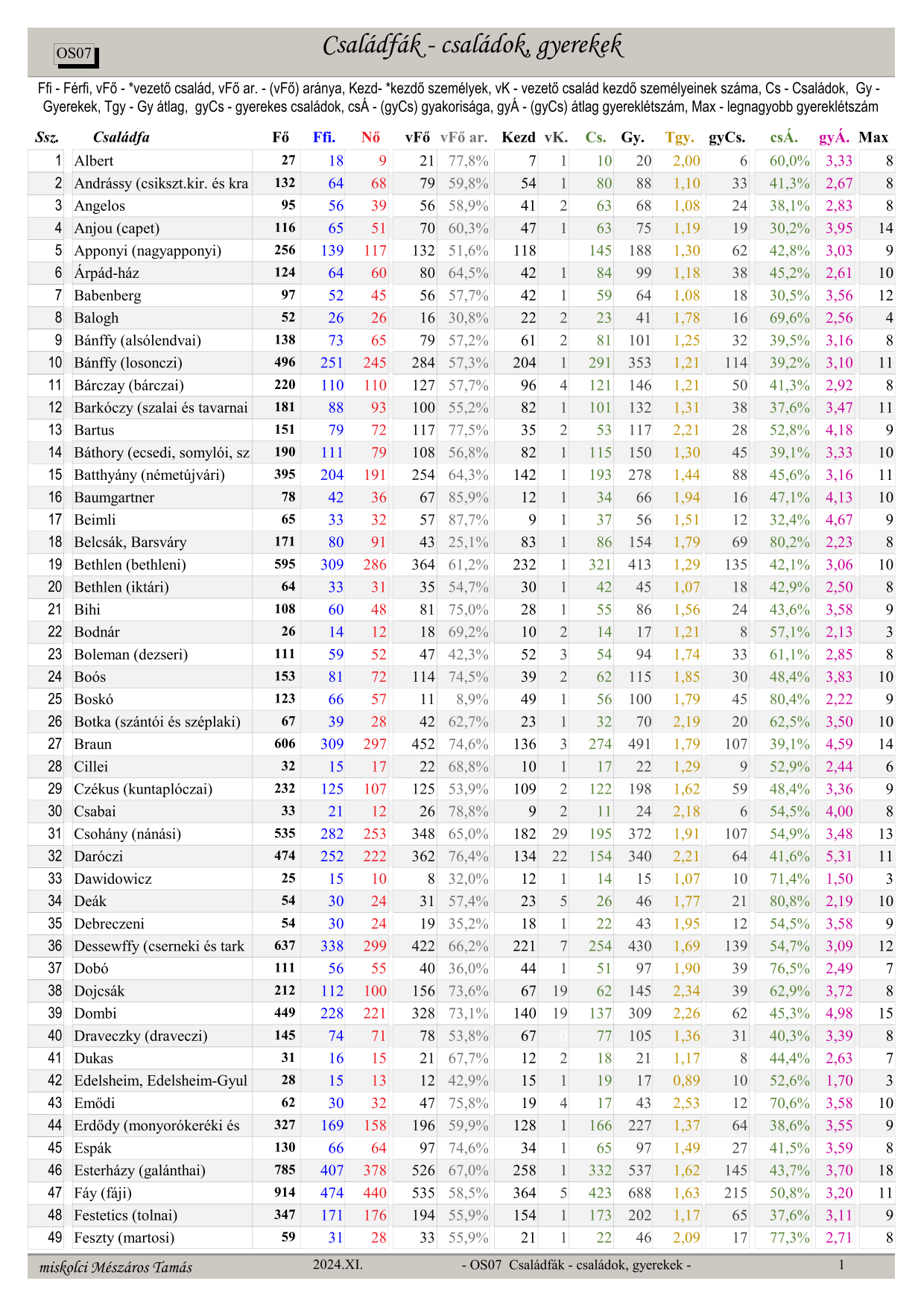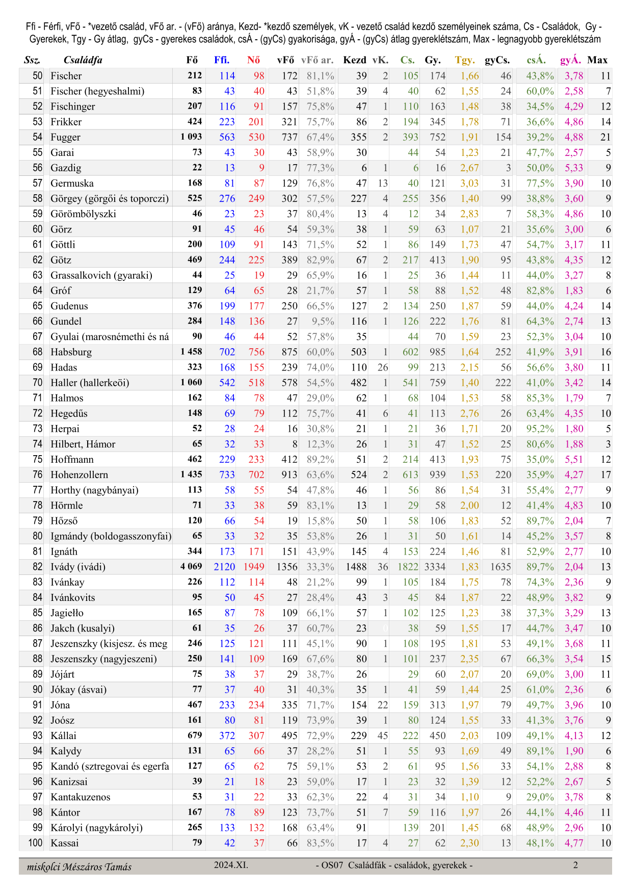 (Stammbäume – Familien, Kinder) Haupt (Personenanzahl des Stammbaums), Mann – Ffi (blau), Frau – rot, vFő – Personenanzahl der führenden Familie, vFő ar – Verhältnis von vFő, Kezd – Anzahl der Startpersonen (Personen mit fremdem Nachnamen, haben keinen Stammbaum in der CsAT – sie beginnen ihre Familie.), vK – Anzahl der Startpersonen der führenden Familie, Cs – Anzahl der Familien, Gy – Kinder, Tgy – Gy Durchschnitt, gyCs – Familien mit Kindern, csÁ – Häufigkeit von gyCs, gyÁ – durchschnittliche Kinderanzahl von gyCs, Max – größte Kinderanzahl