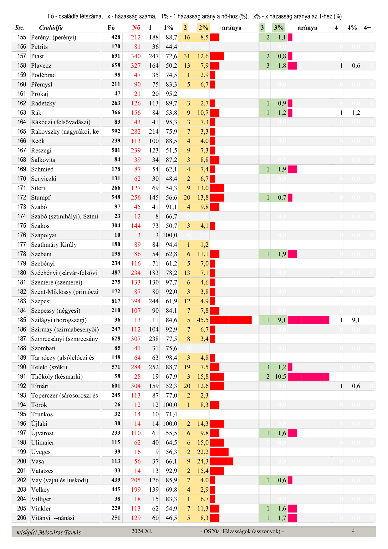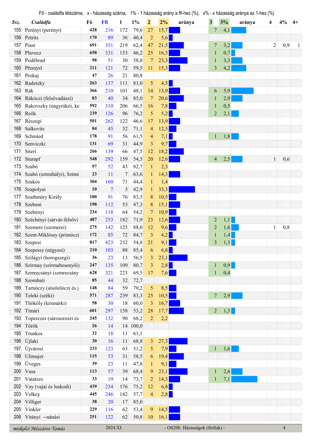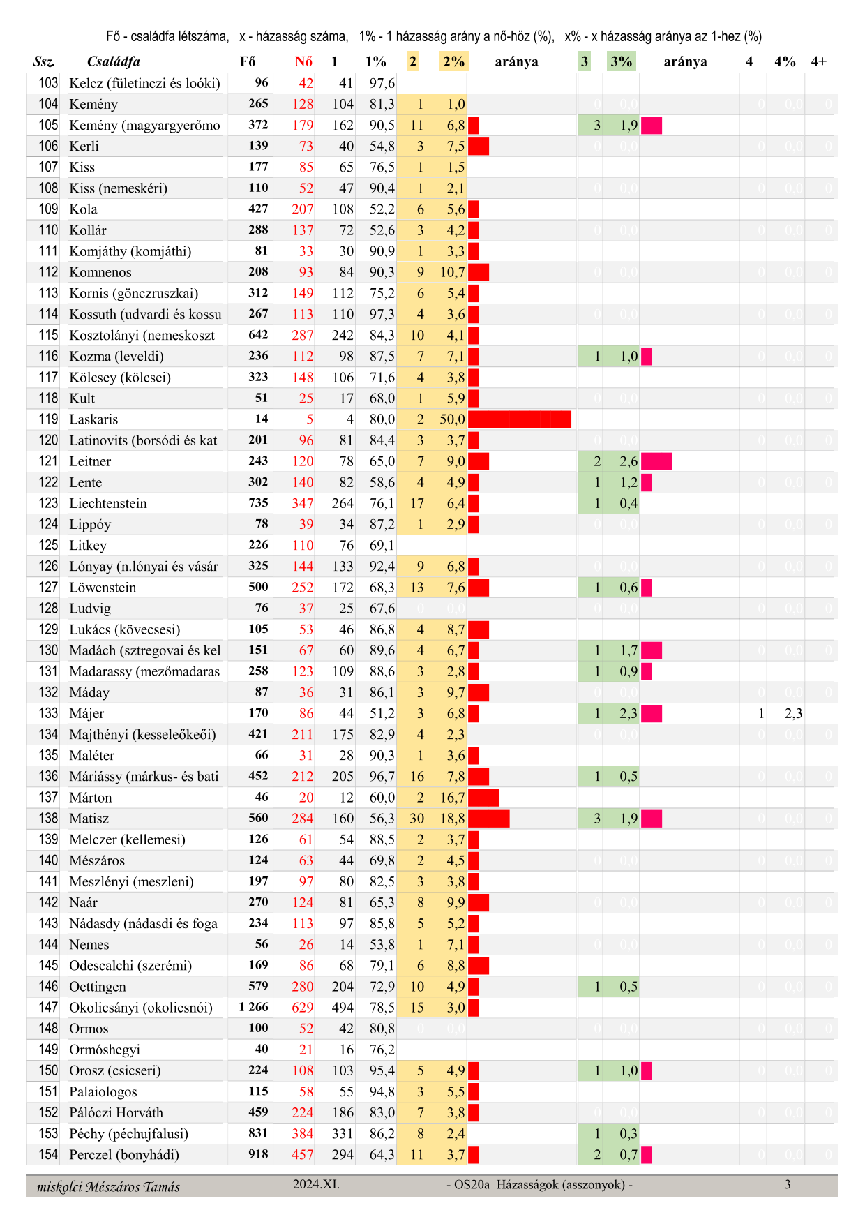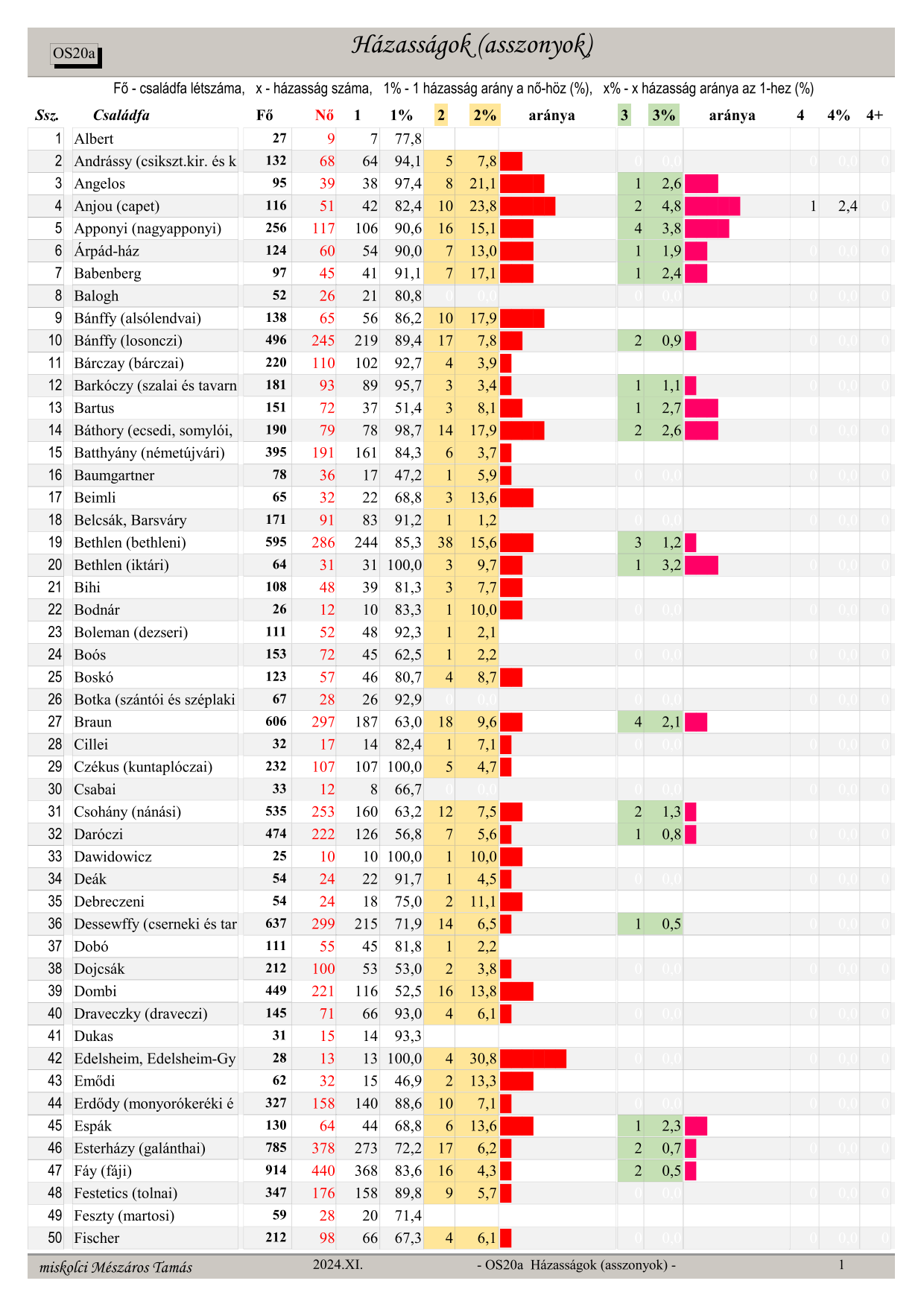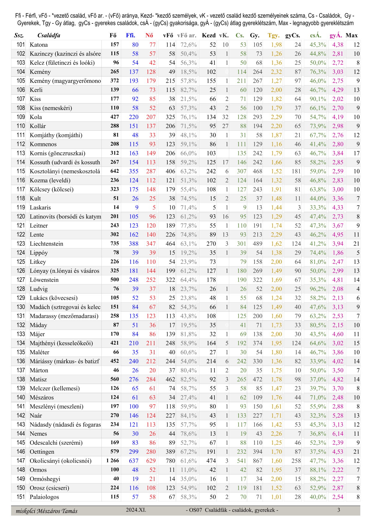 (Stammbäume – Familien, Kinder) Haupt (Personenanzahl des Stammbaums), Mann – Ffi (blau), Frau – rot, vFő – Personenanzahl der führenden Familie, vFő ar – Verhältnis von vFő, Kezd – Anzahl der Startpersonen (Personen mit fremdem Nachnamen, haben keinen Stammbaum in der CsAT – sie beginnen ihre Familie.), vK – Anzahl der Startpersonen der führenden Familie, Cs – Anzahl der Familien, Gy – Kinder, Tgy – Gy Durchschnitt, gyCs – Familien mit Kindern, csÁ – Häufigkeit von gyCs, gyÁ – durchschnittliche Kinderanzahl von gyCs, Max – größte Kinderanzahl