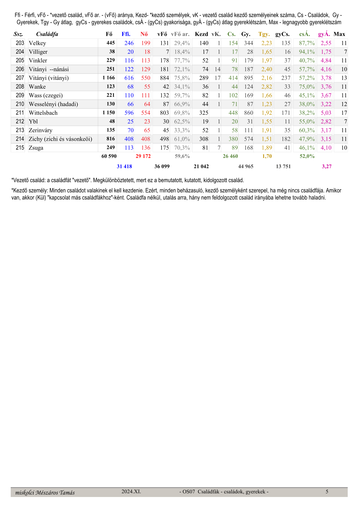 (Drzewa genealogiczne – rodziny, dzieci) Główny (liczba osób w drzewie genealogicznym), Mężczyzna – Ffi (niebieski), Kobieta – czerwony, vFő – liczba osób w wiodącej rodzinie, vFő ar – proporcja vFő, Kezd – Liczba osób początkowych (Osoby o obcym nazwisku, nie mają drzewa genealogicznego w CsAT – zaczynają swoją rodzinę.), vK – liczba osób początkowych wiodącej rodziny, Cs – liczba rodzin, Gy – dzieci, Tgy – średnia Gy, gyCs – rodziny z dziećmi, csÁ – częstotliwość gyCs, gyÁ – średnia liczba dzieci gyCs, Max – największa liczba dzieci