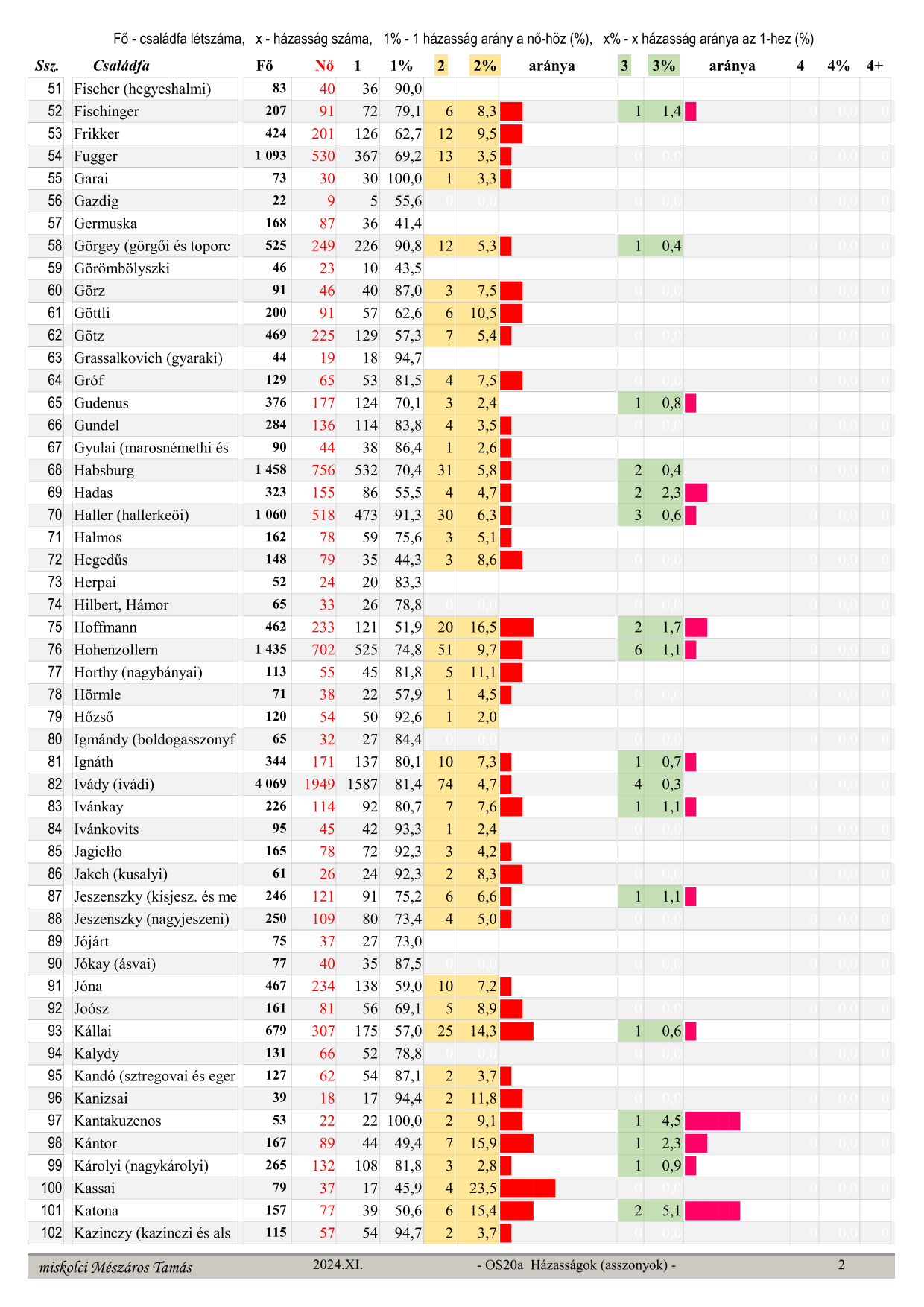 (Heiraten (Ehefrauen)) "Fő" – Personenanzahl des Stammbaums, "Nő" – rot (Personenanzahl der Frauen), 1 – Anzahl der Frauen, die einmal geheiratet haben, 1% - Verhältnis der einmal Verheirateten zur "Nő" Personenanzahl, 2 – Anzahl der Frauen, die zum zweiten Mal geheiratet haben, 2% - Verhältnis von 2, und so weiter bis 4, 4+ - >4