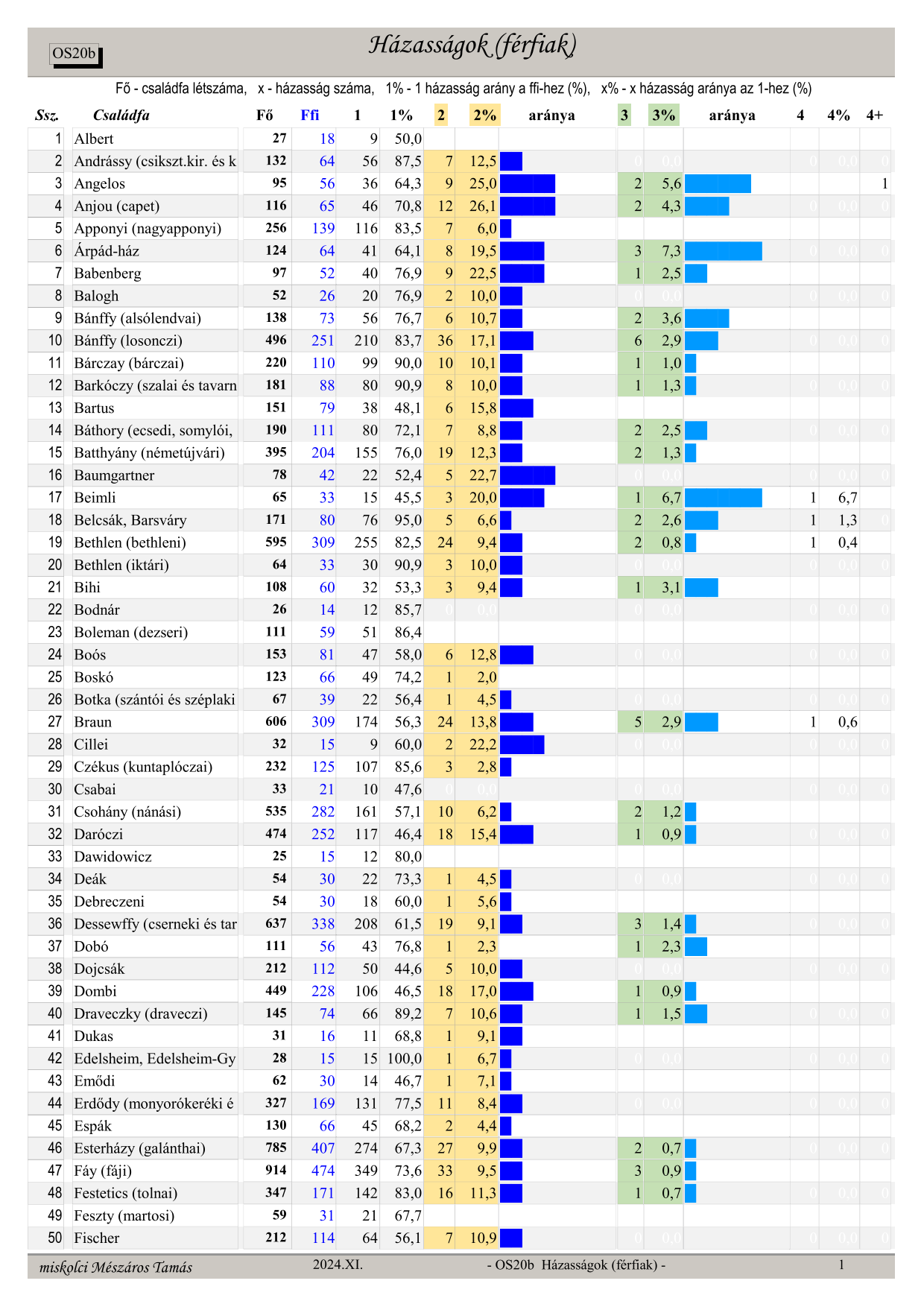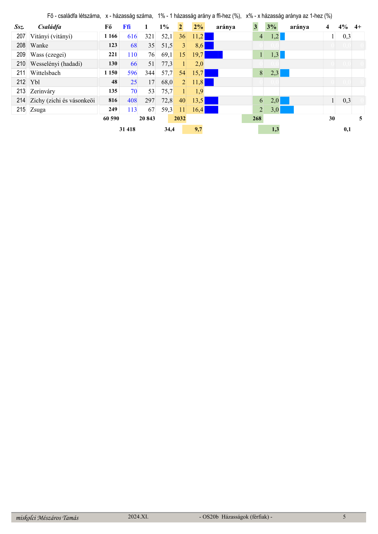 (Małżeństwa (mężczyźni)) "Fő" – liczba osób w drzewie genealogicznym, "Ffi" – niebieski (liczba mężczyzn), 1 – liczba mężczyzn, którzy ożenili się jeden raz, 1% - stosunek tych, którzy ożenili się jeden raz do populacji "Ffi", 2 – liczba mężczyzn, którzy ożenili się po raz drugi, 2% - stosunek 2, i tak dalej do 4, 4+ - >4